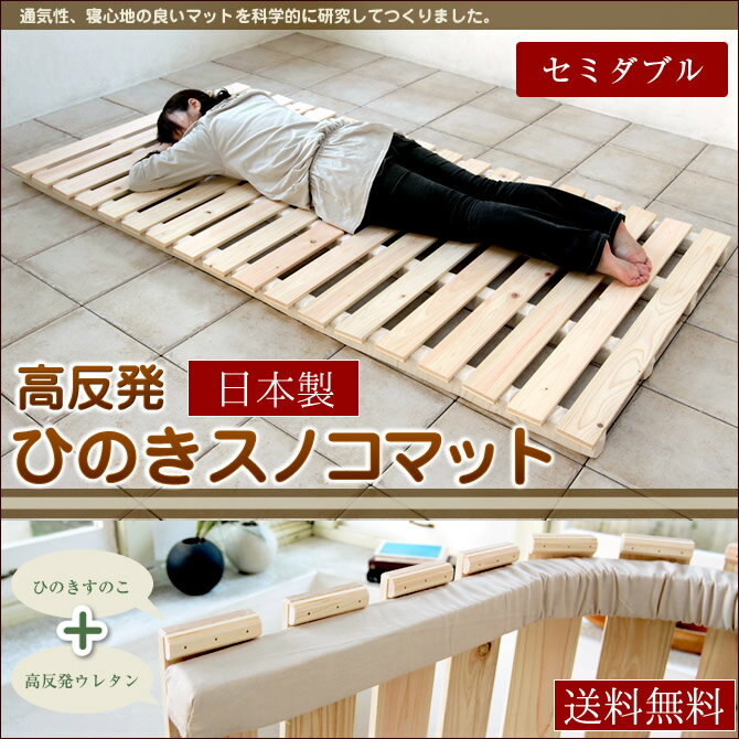 北海道への配送は別途送料がかかります。北海道送料:【北4】タイプ ※沖縄県・離島へのお届けは別途お見積もりになりますので問い合わせください。※お届けの際、日曜祝日の指定はお受けできません。 ※時間指定は1便(9-14時)、2便(12-18時)、終日便(9-18時)のみとなります。※地域によって配送の曜日が限定される場合や、時間指定が承れない場合がございます。■商品名:日本製 高反発ウレタン+ヒノキスノコマット高さ6cm セミダブル 広島府中家具 通気性の良い天然木製 ひのきすのこマット 丸めて収納省スペース すのこベッド ひのきの香りで快眠 マットのみ ■寸法本体:巾135×長200×高6cm 重 量:15kg■素材 天然木 ひのき 布綿100% クッション材 チップウレタン■塗装 すのこ:無塗装■生産国 日本製 ◆備考◆